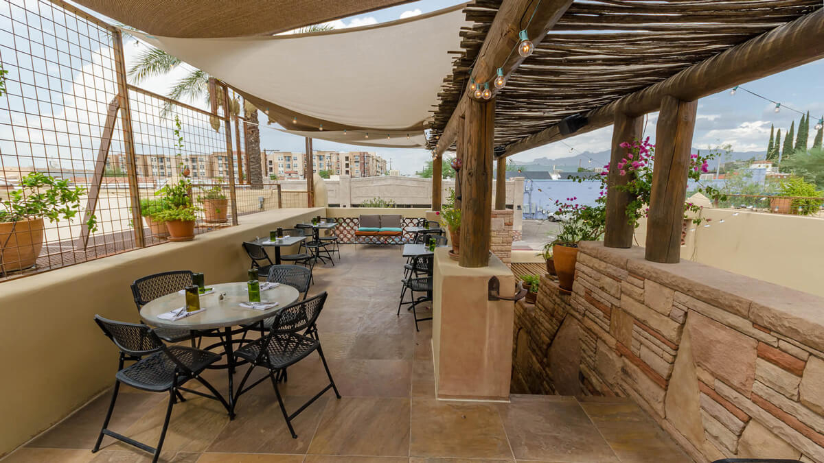 Scenic outdoor oasis w/ water feature & rooftop patio offering spectacular Catalina Mountains views.